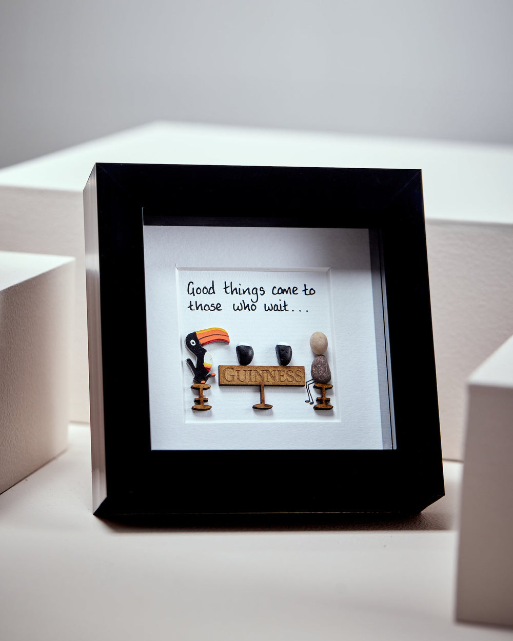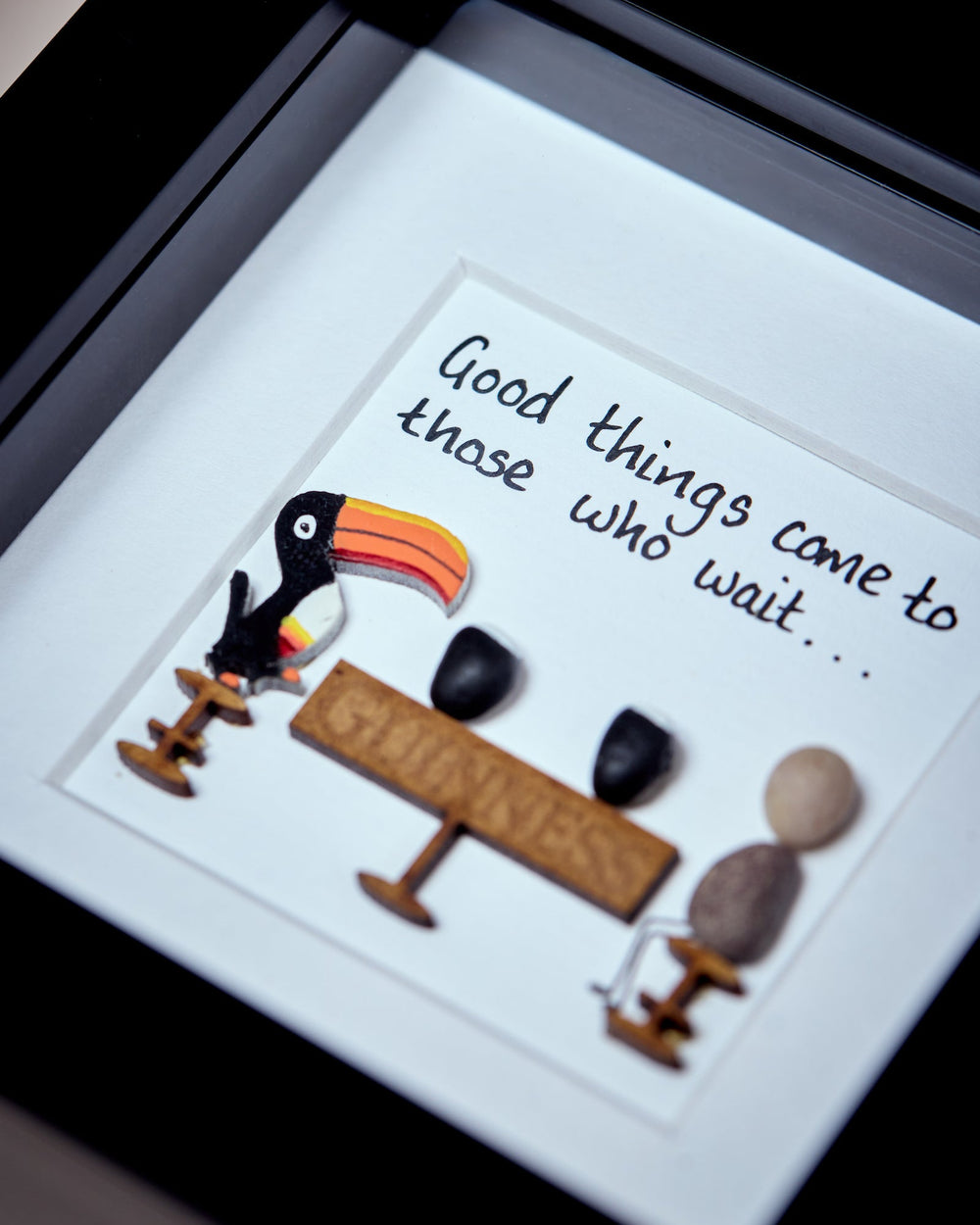 Inspired by the classic Guinness phrase, “Good things come to those who wait,” this artwork combines natural pebbles with a playful toucan motif. The design evokes patience and reward, making it a thoughtful addition to any space. Each piece is handmade, ensuring no two are exactly alike.
