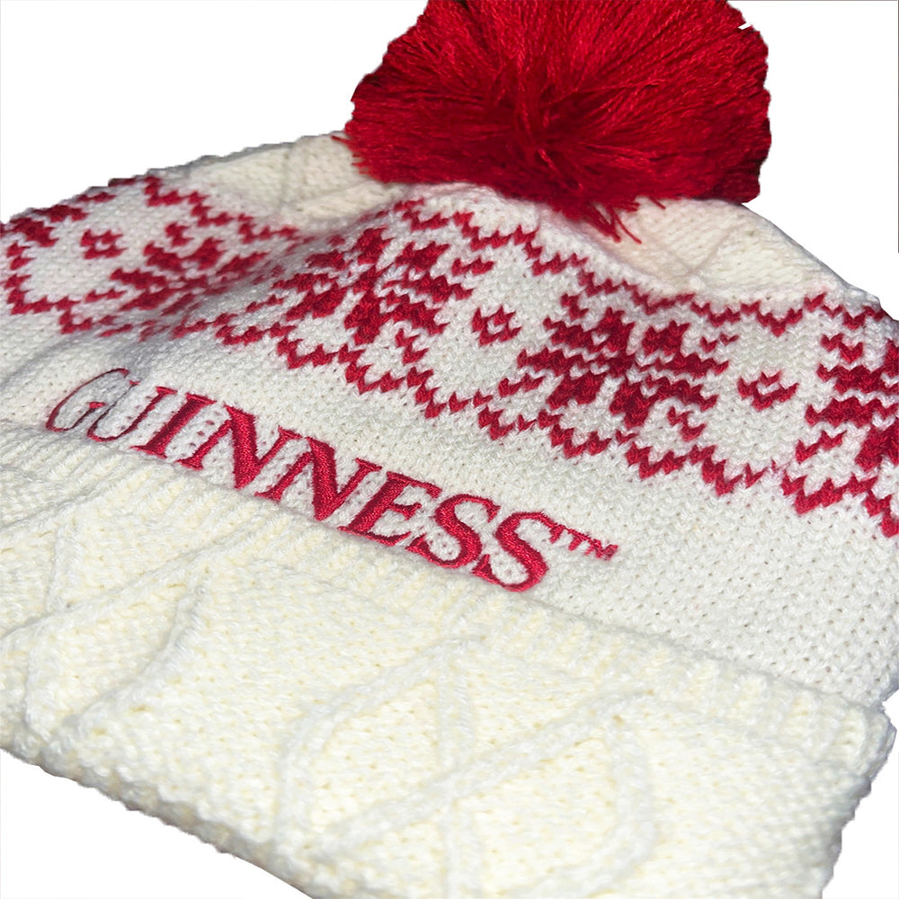 Bring festive warmth to your winter look with this cozy Guinness Christmas hat. Crafted in soft white knit with a bold red snowflake pattern, it features the iconic Guinness logo embroidered on the cuff and a vibrant red pom-pom on top for a cheerful finish. Perfect for holiday gatherings, chilly walks, or gifting to any Guinness enthusiast.