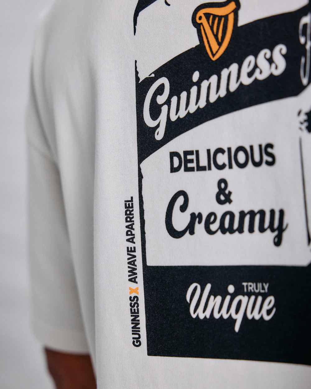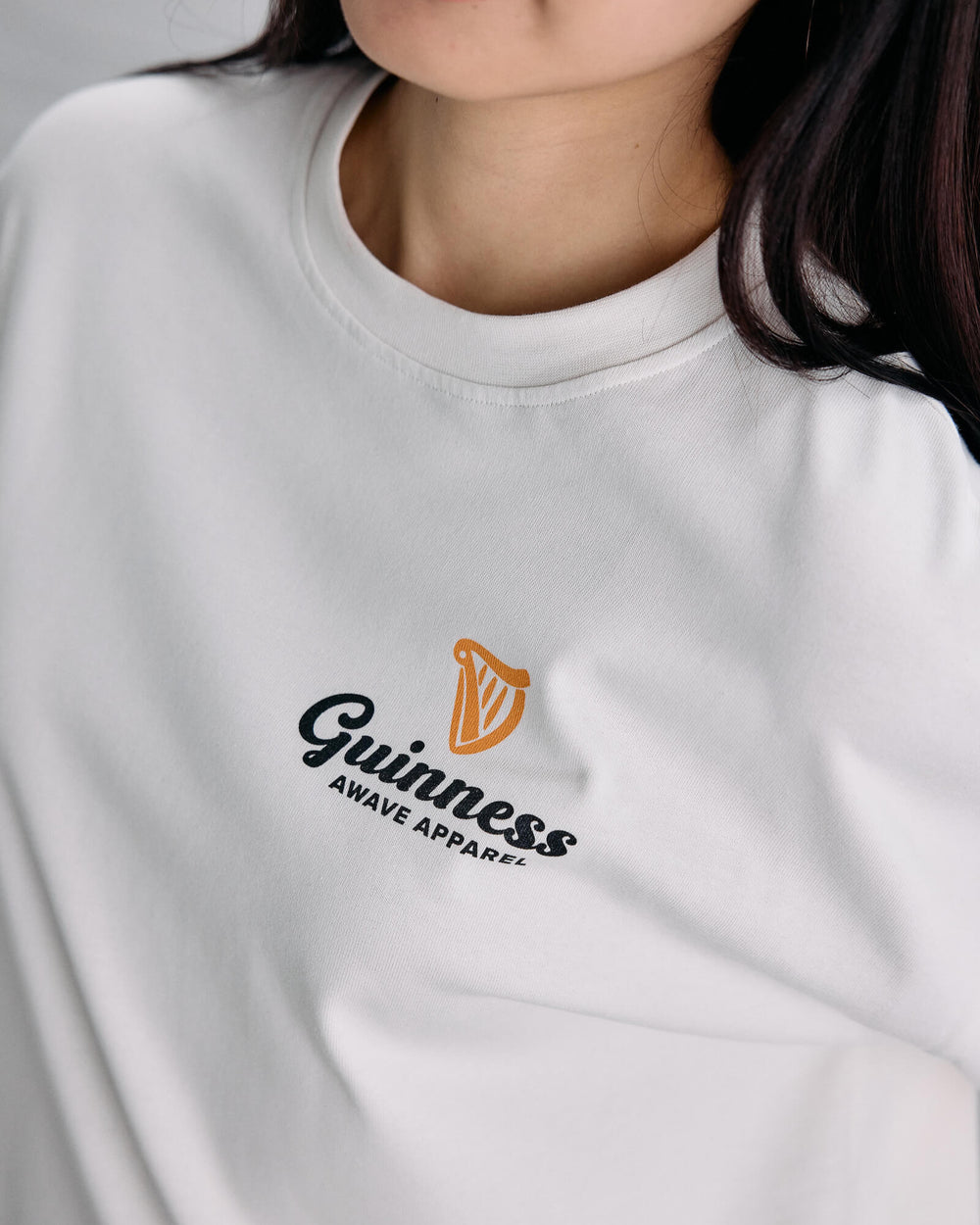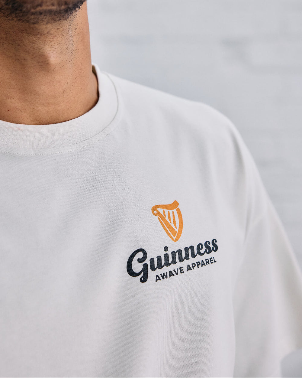 Guinness has partnered with Awave Apparel to launch an exclusive summer collection at the Guinness Storehouse in Dublin, Ireland. Introducing the stylish and comfortable white T-Shirt, designed by Awave Apparel. This unique piece takes Guinness branding to a personalized and stylized level. Crafted from high-quality materials, the T-Shirt ensures both comfort and breathability, making it perfect for a sunny day in Dublin. It is a heavyweight jersey fabric at 240gsm, with dropped shoulders and a boxy, oversized fit. The front features an artistic Guinness logo, while the back showcases a quirky, stylized milk carton, attesting to the quality and creaminess of the classic Guinness beverage. All designs are screen printed for durability, ensuring they last for countless wears. Experience the fusion of iconic branding and innovative design with this standout addition to your summer wardrobe.