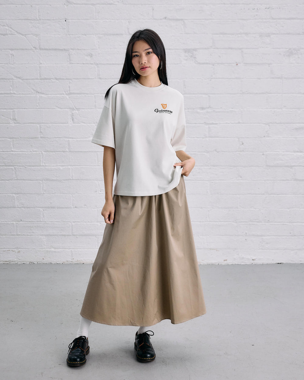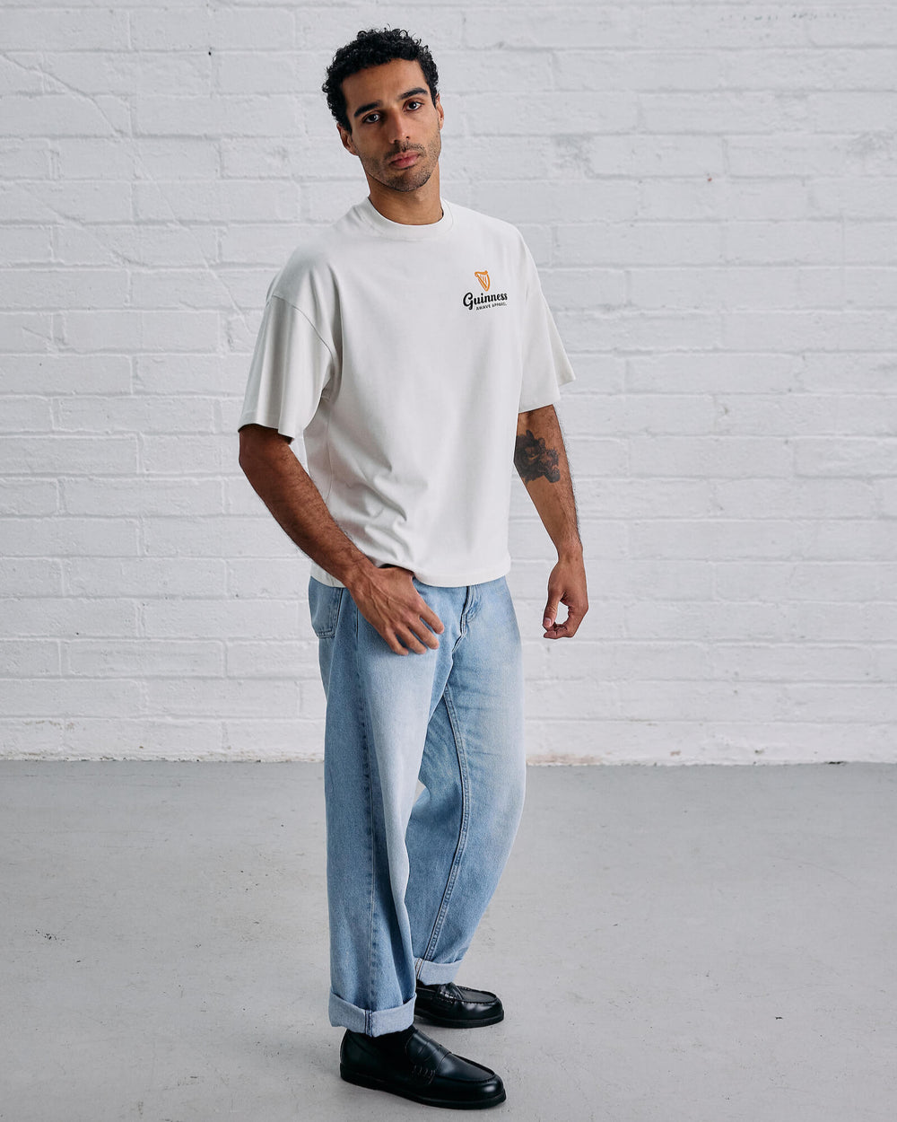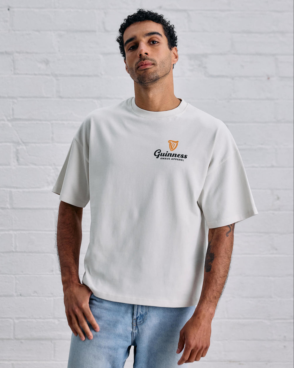 Guinness has partnered with Awave Apparel to launch an exclusive summer collection at the Guinness Storehouse in Dublin, Ireland. Introducing the stylish and comfortable white T-Shirt, designed by Awave Apparel. This unique piece takes Guinness branding to a personalized and stylized level. Crafted from high-quality materials, the T-Shirt ensures both comfort and breathability, making it perfect for a sunny day in Dublin. It is a heavyweight jersey fabric at 240gsm, with dropped shoulders and a boxy, oversized fit. The front features an artistic Guinness logo, while the back showcases a quirky, stylized milk carton, attesting to the quality and creaminess of the classic Guinness beverage. All designs are screen printed for durability, ensuring they last for countless wears. Experience the fusion of iconic branding and innovative design with this standout addition to your summer wardrobe.